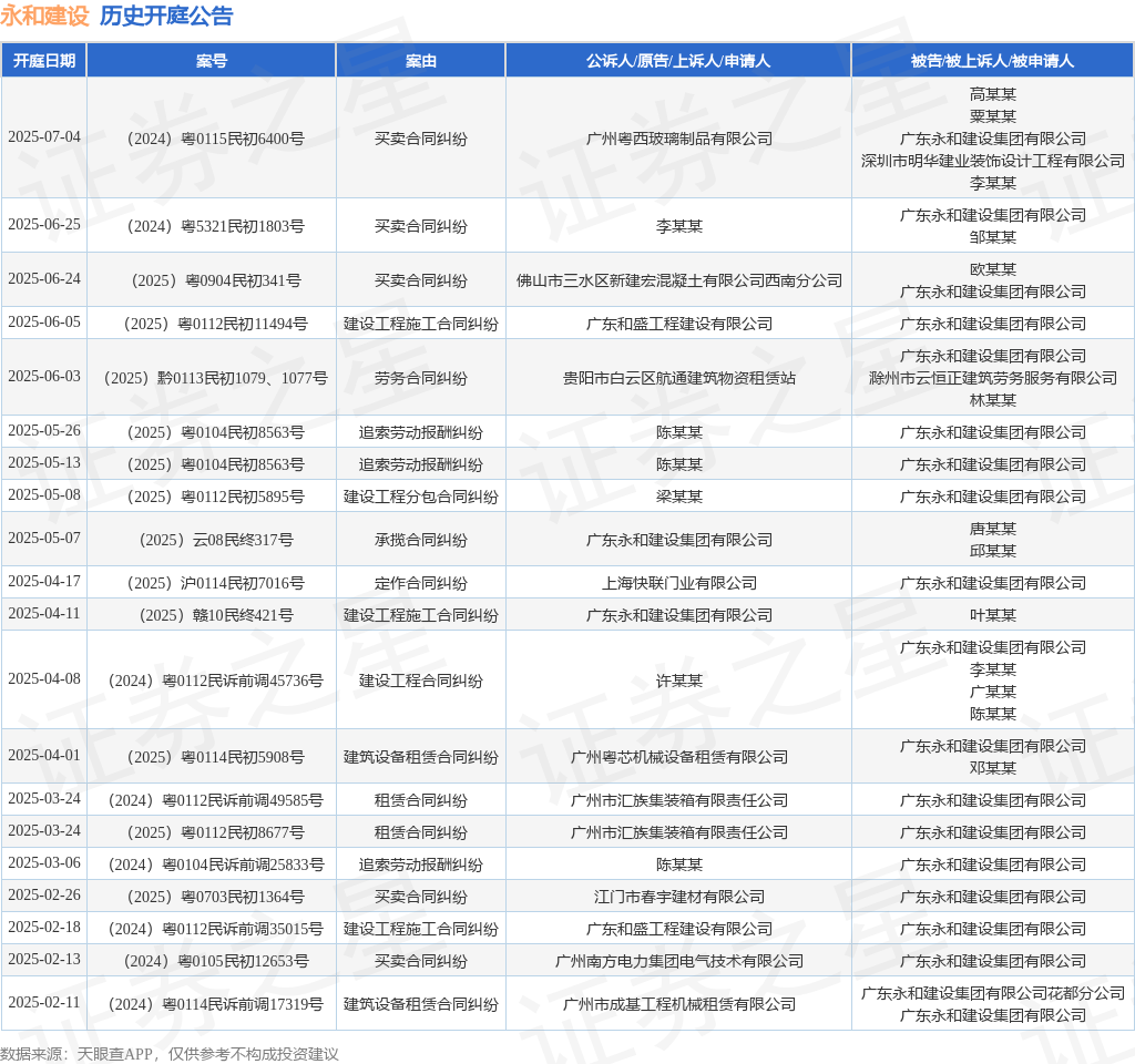 案号:(2025)粤0112民初11494号审理法院:广州市黄埔区人民法院案由:建设工程施工合同纠纷当事人信息: 原告/上诉人:广东和盛工程建设有限公司 被告/被上诉人:广东永和建设集团有限公司开庭日期:2025年6月5日根据统计,近一年内以广东永和建设集团有限公司为当事人的历史开庭公告有64则,其中案由为“买卖合同纠纷”的公告以13则居首,其次为“建设工程施工合同纠纷”有13则,“建筑设备租赁合同纠纷”有6则。历史开庭公告(前20条)如下: