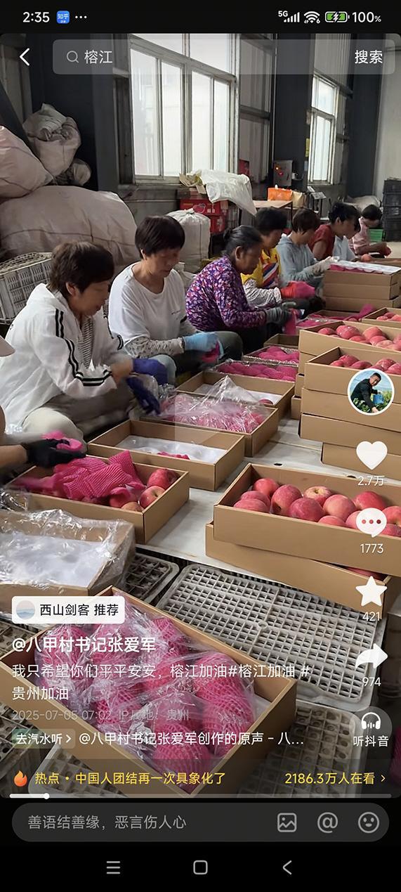 6月24日以来,贵州省榕江县城遭遇罕见洪灾,灾情牵动着远在千里之外的观水镇八甲村党支部书记张爱军的心。想到此刻的灾区人民应该急需生活物资,他决定向灾区捐赠最具烟台元素的苹果,苹果也有“平安”的寓意。每天随时关注灾情动态变化的张爱军定制了一批“榕江加油”的苹果包装箱,组织人员将苹果从冷库里取出,套上防碰撞的袋子。村里其他村民知道张爱军采购苹果,要向灾区老百姓献爱心,也纷纷前来帮忙分拣、装箱。同时,张爱军知道洪灾过后当地饮用水紧缺,加上又是酷热难耐的盛夏,又另外采购了1.5万瓶纯净水、200箱方便面等应急物资。