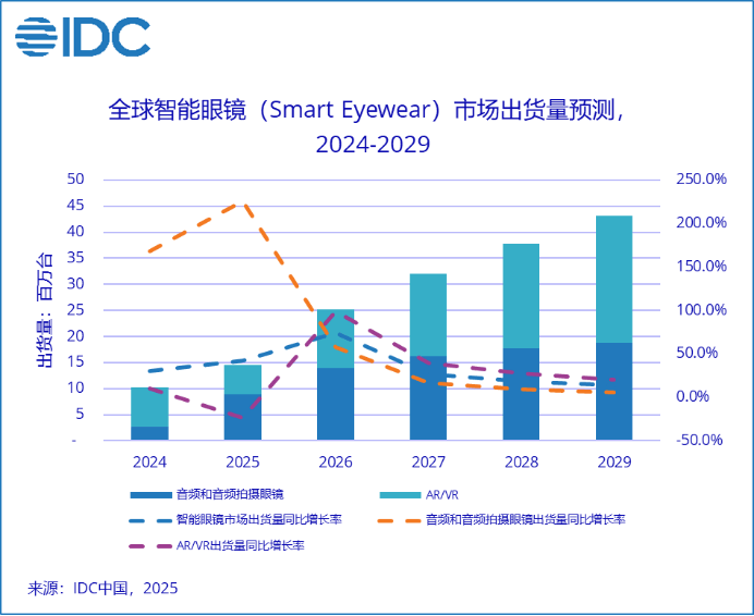 IDC数据显示,2025年第一季度中国智能眼镜市场出货量约为49.4万副,同比增长116.1%;预计全年市场规模将达到290.7万副,实现121.1%的同比增长。市场规模虽远不及智能手机,但胜在增长性突出。