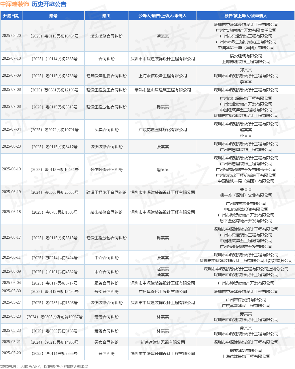 案号:(2025)粤0115民初5515号审理法院:广州市南沙区人民法院案由:建设工程分包合同纠纷当事人信息: 原告/上诉人:揭某某 被告/被上诉人:深圳市中深建装饰设计工程有限公司、广州市忠鼎装饰工程有限公司、中国建筑第五工程局有限公司、广州隽业房地产开发有限公司开庭日期:2025年6月17日根据统计,近一年内以深圳市中深建装饰设计工程有限公司为当事人的历史开庭公告有122则,其中案由为“装饰装修合同纠纷”的公告以25则居首,其次为“买卖合同纠纷”有22则,“建设工程施工合同纠纷”有19则。历史开庭公告(前20条)如下: