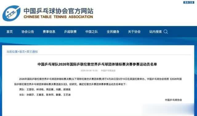 北京时间4月9日消息,2026年WTT常规挑战赛太原站火热进行,中国乒乓球队出战伦敦世乒赛团体赛的名单也火热出炉。男子单打方面,参赛的5名球员是王楚钦、林诗栋、周启豪、向鹏、梁靖崑。这份名单中,没有大满贯樊振东的名字。